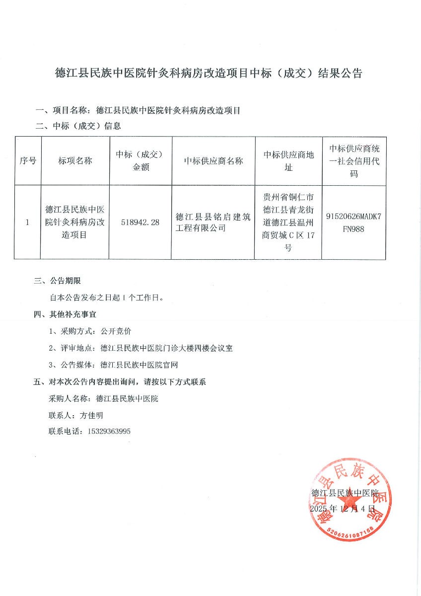 德江县民族中医院针灸科病房改造项目中标(成交)结果公告